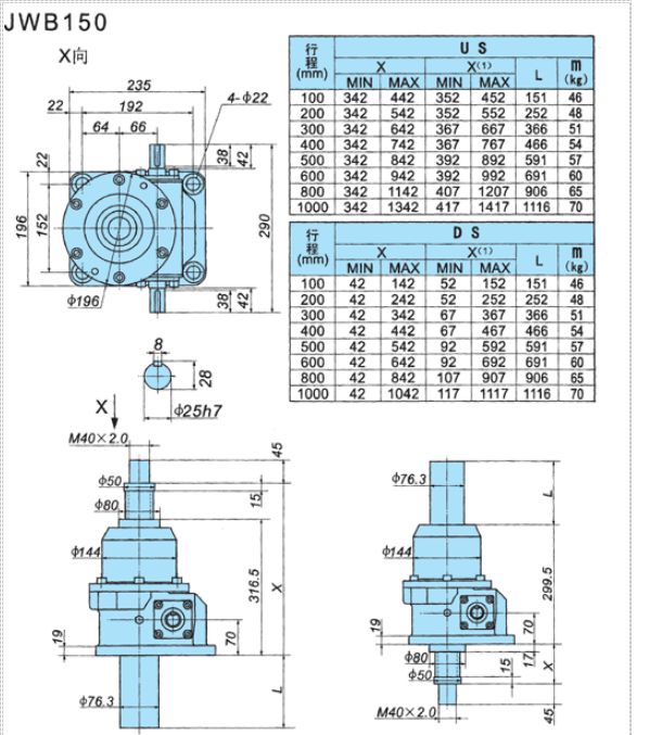 JWB型(普通滾珠絲桿型),適用于高速,高頻率和高性能的裝置中,主要構(gòu)成部件為精密滾珠絲桿副與高精度蝸輪蝸桿副。